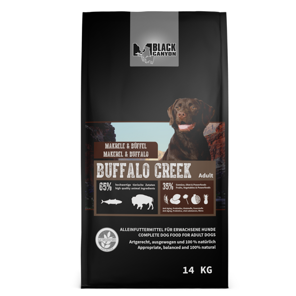 Trockenfutter punktet durch außergewöhnliche Zutaten. Insgesamt 65% tierische Zutaten stellen sicher, dass Ihr Hund mit jeder Mahlzeit genau das bekommt, was er braucht: tierische Proteine für eine fitte und straffe Muskukaltur und ein starkes Immunsystem. Das verwendete Büffelfleisch ist besonders mager und bekömmlich. Es verfügt über einen hohen Anteil an Mineralstoffen und ist auch für empfindliche Mägen sehr gut verträglich.