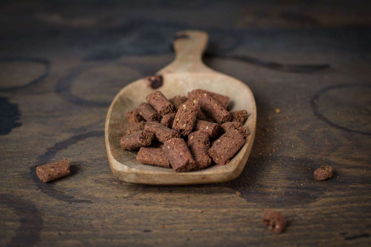 Unser Snack ist getreidefrei und besteht aus 30% Insektenprotein (Mehlwürmer und Hermetia Larven) mit einem Gemüsemix aus Kartoffel, Süßkartoffel, Rote Beete, Karotte und Kürbis